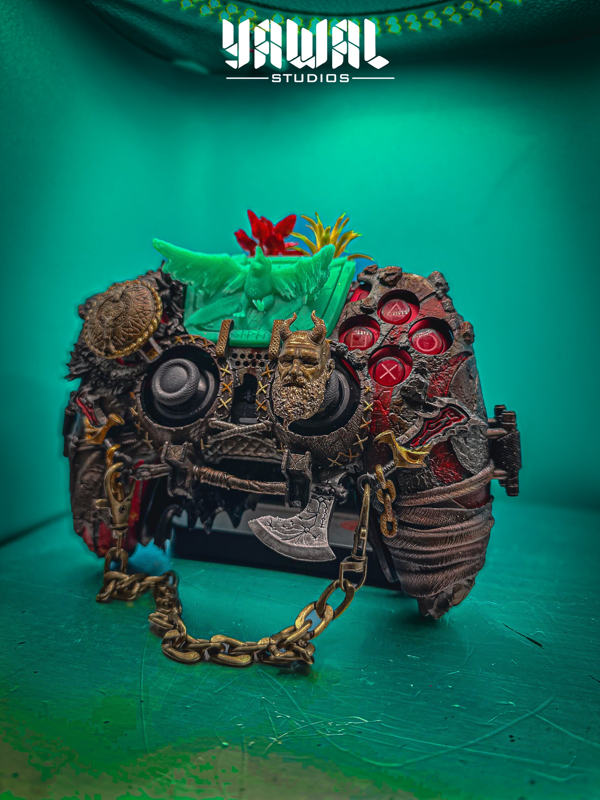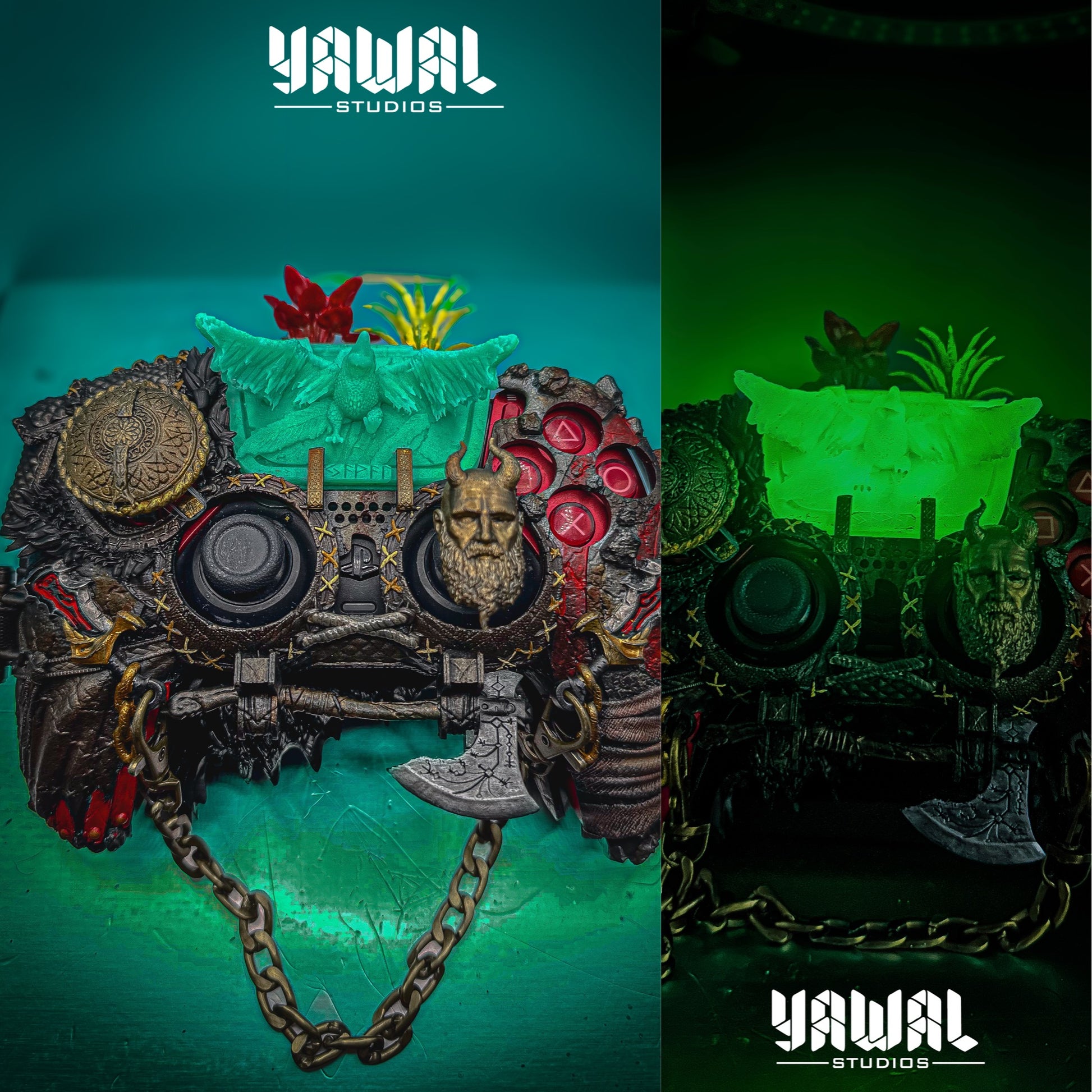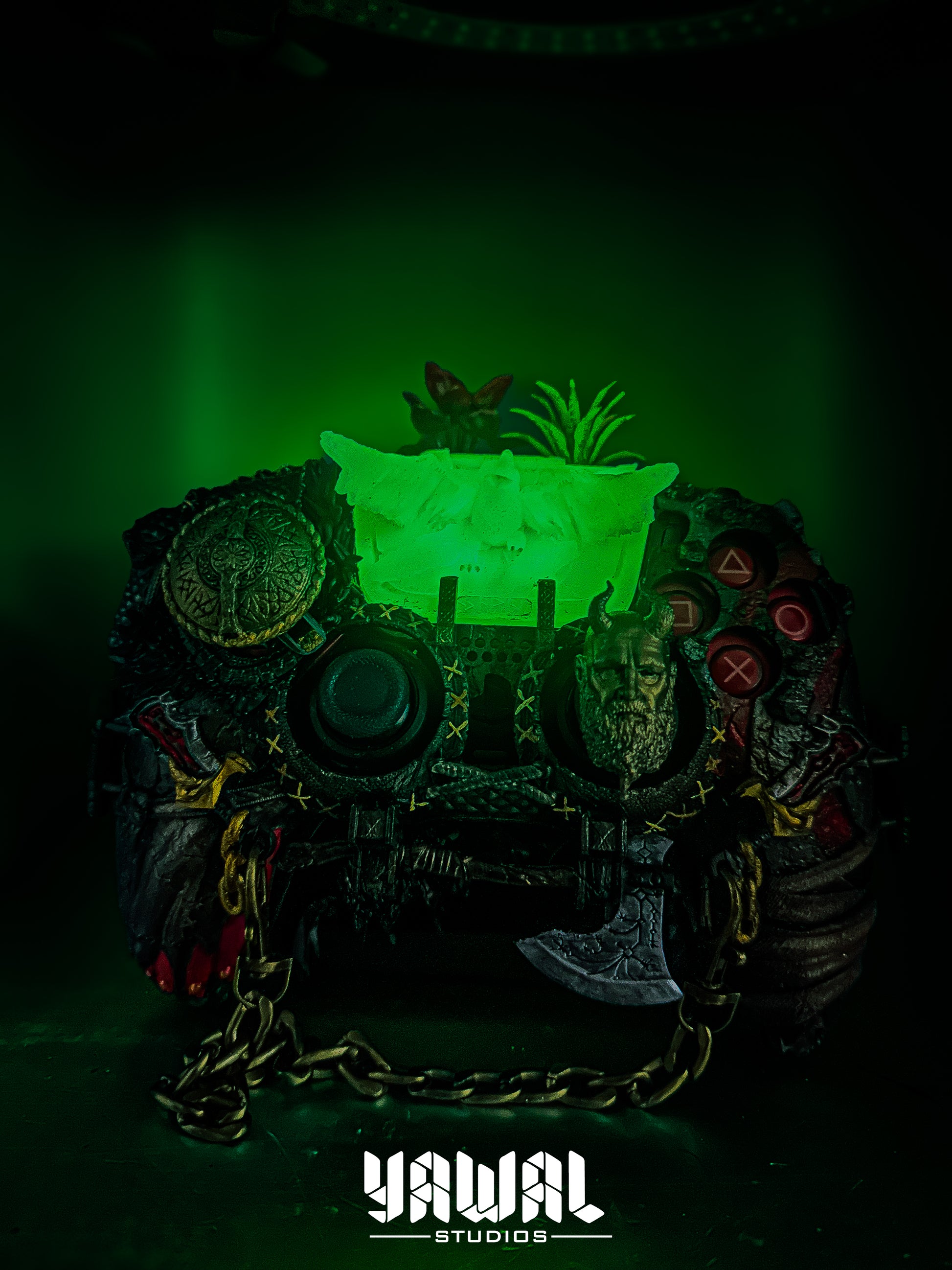 Level up your setup with this handcrafted God of War PS5 controller case by @yawalstudios. It glows in the dark with sunlight or the included UV lantern โ๏ธ๐ฆ, includes a custom joystick cover ๐ฎ, and keeps every button easy to reach and full joystick reach. Designed for comfort and immersive gameplay โ๏ธ